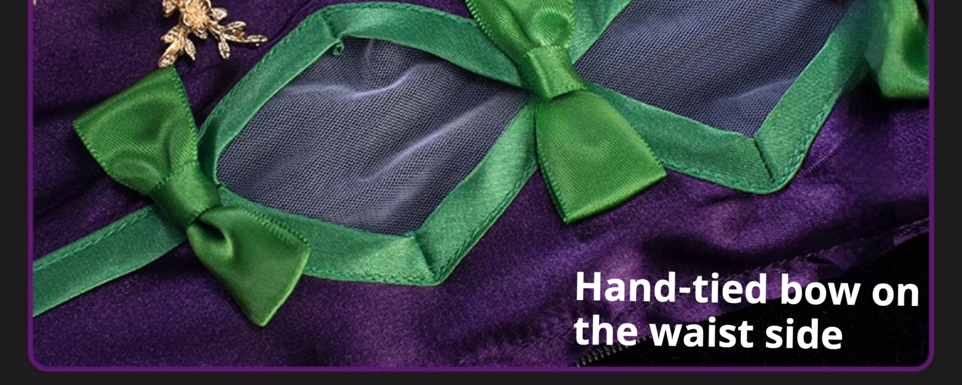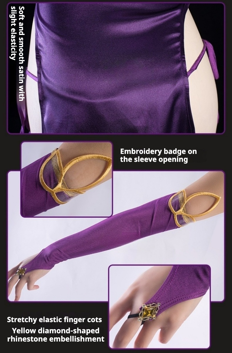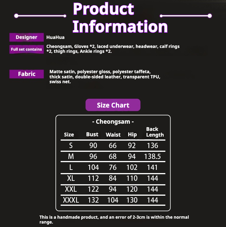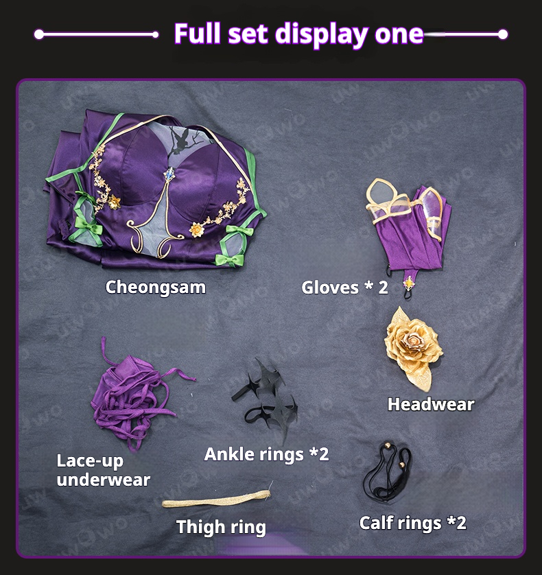 Cheongsam, Gloves *2, laced underwear, headwear, calf rings *2, thigh rings, Ankle rings *2.