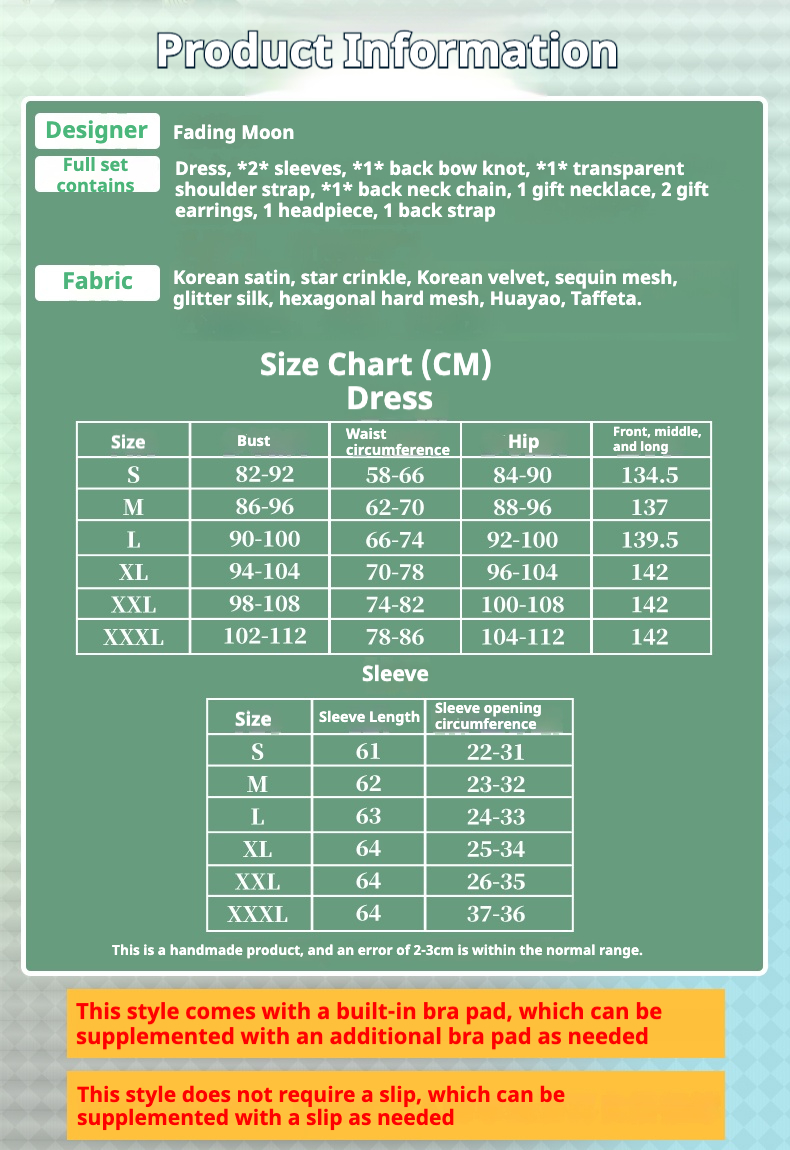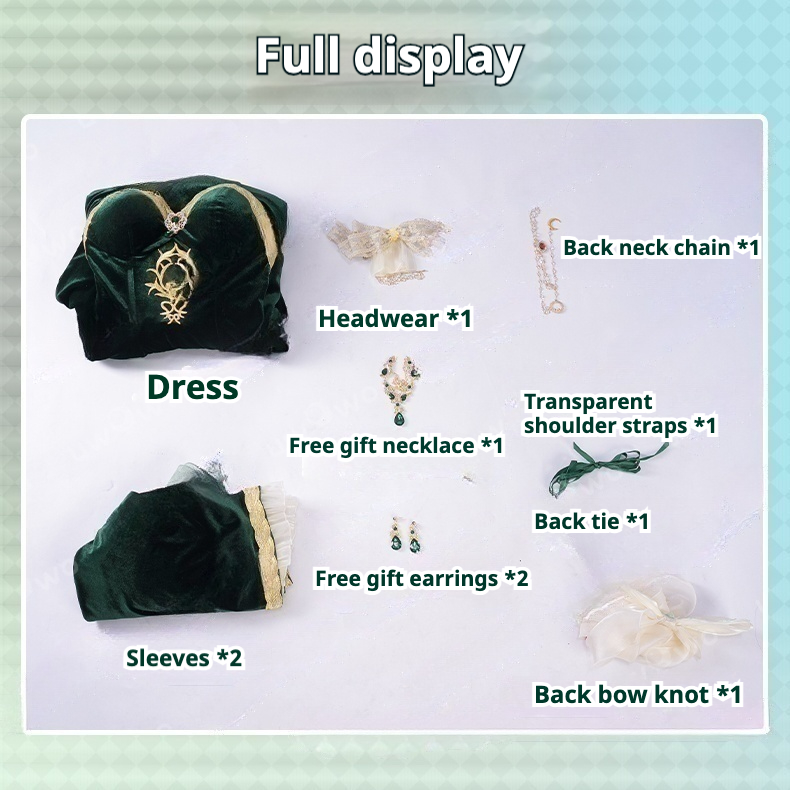 Dress, *2* sleeves, *1* back bow knot, *1* transparent shoulder strap, *1* back neck chain, 1 gift necklace, 2 gift earrings, 1 headpiece, 1 back strap