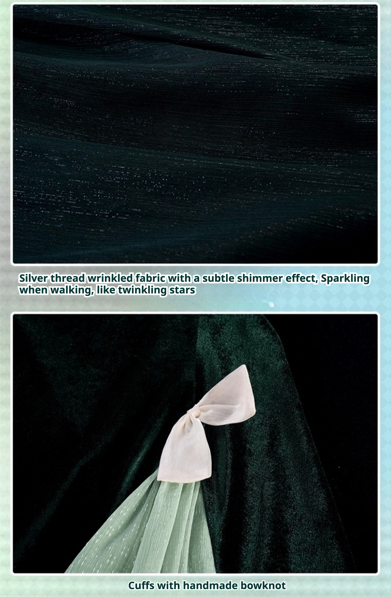 Silver thread wrinkled fabric with a subtle shimmer effect, Sparkling when walking, like twinkling starsCuffs with handmade bowknot