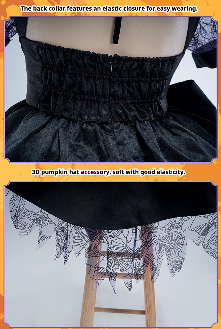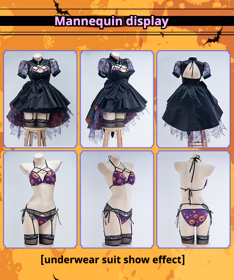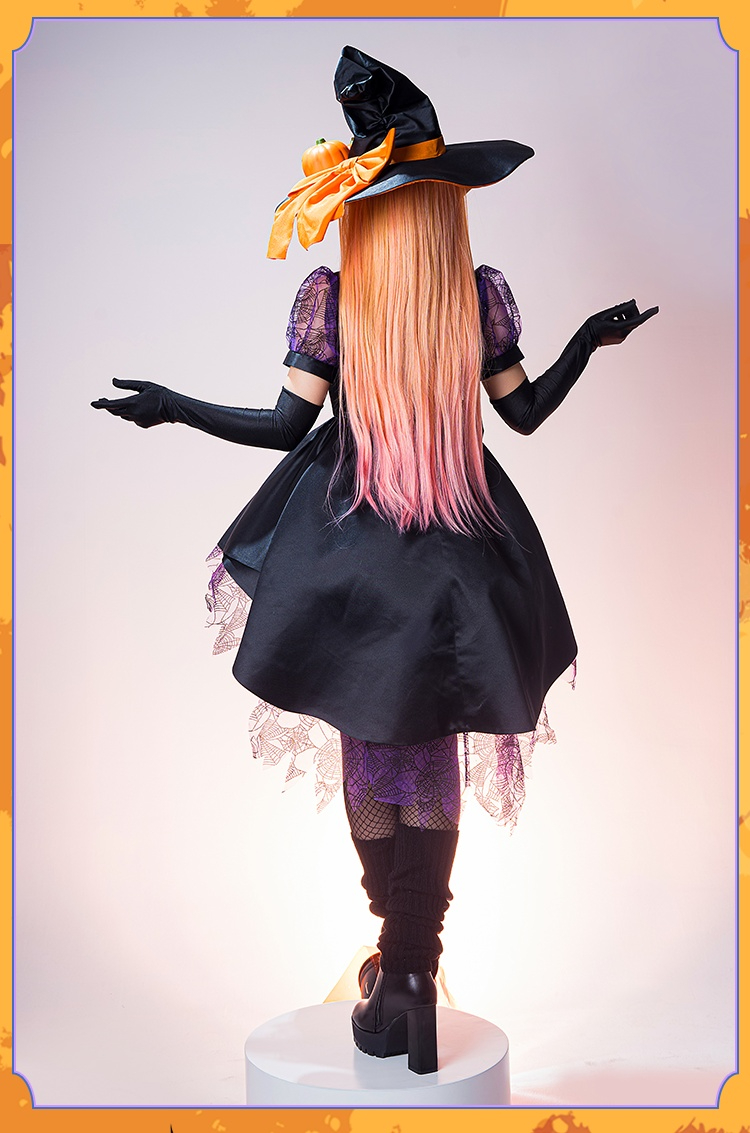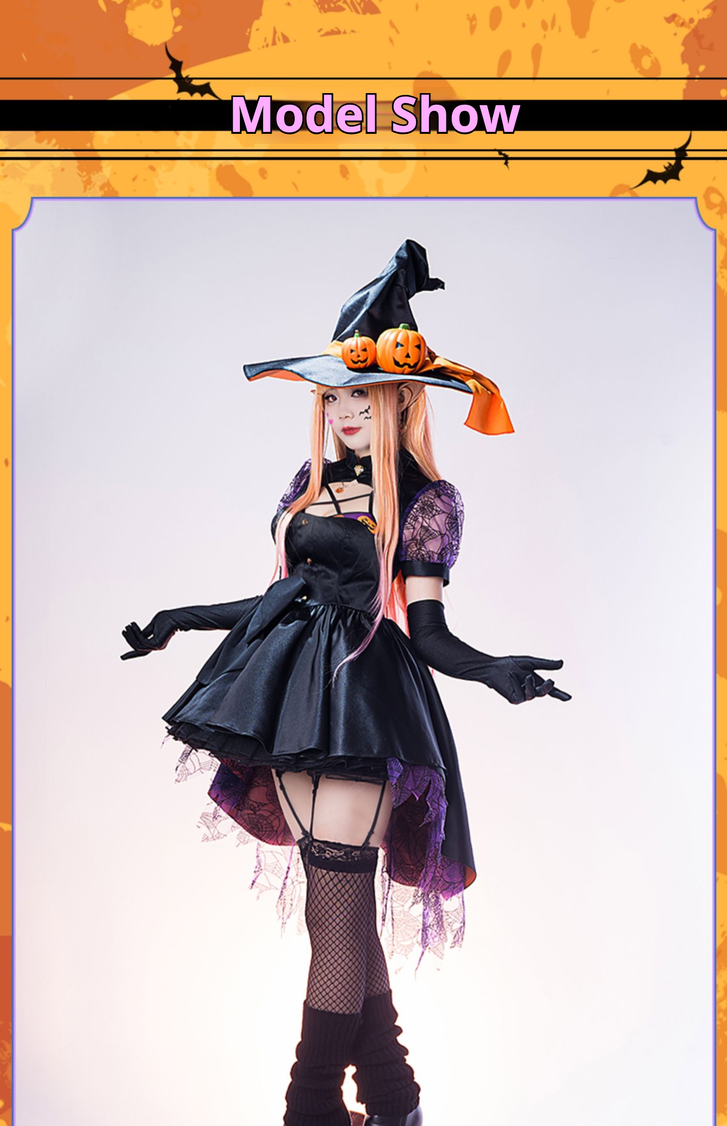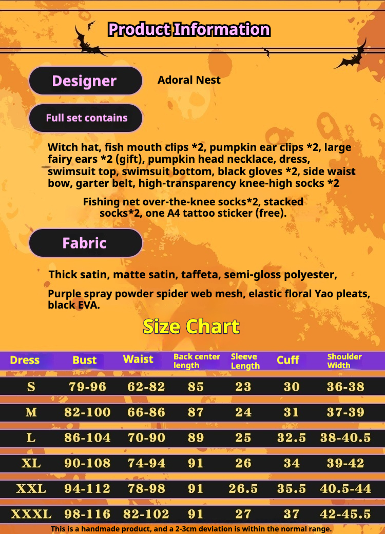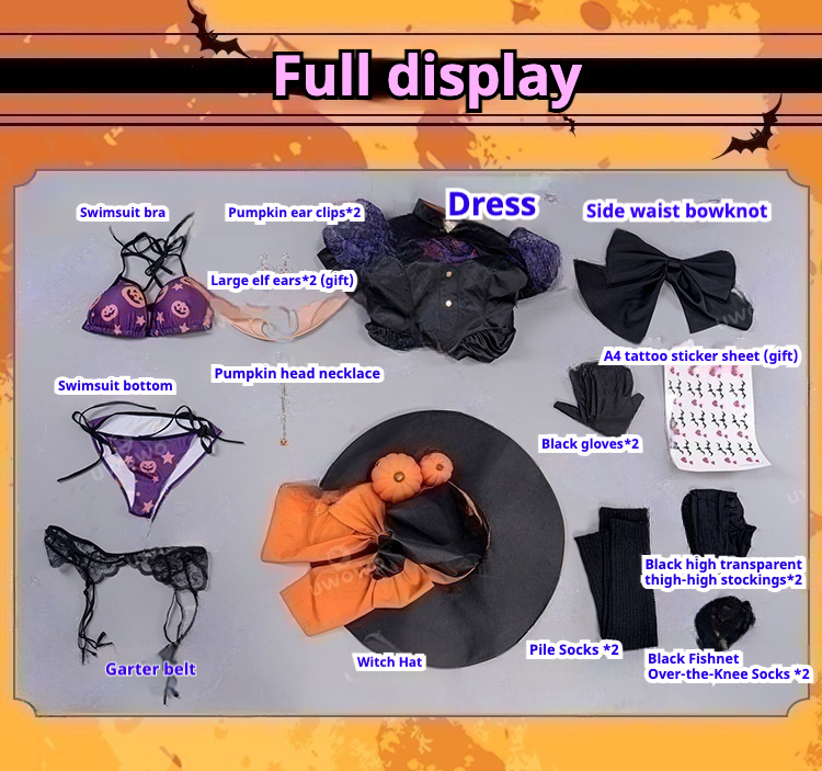 Witch hat, fish mouth clips *2, pumpkin ear clips *2, large fairy ears *2 (gift), pumpkin head necklace, dress, swimsuit top, swimsuit bottom, black gloves *2, side waist bow, garter belt, high-transparency knee-high socks *2, Fishing net over-the-knee socks*2, stacked socks*2, one A4 tattoo sticker (free).