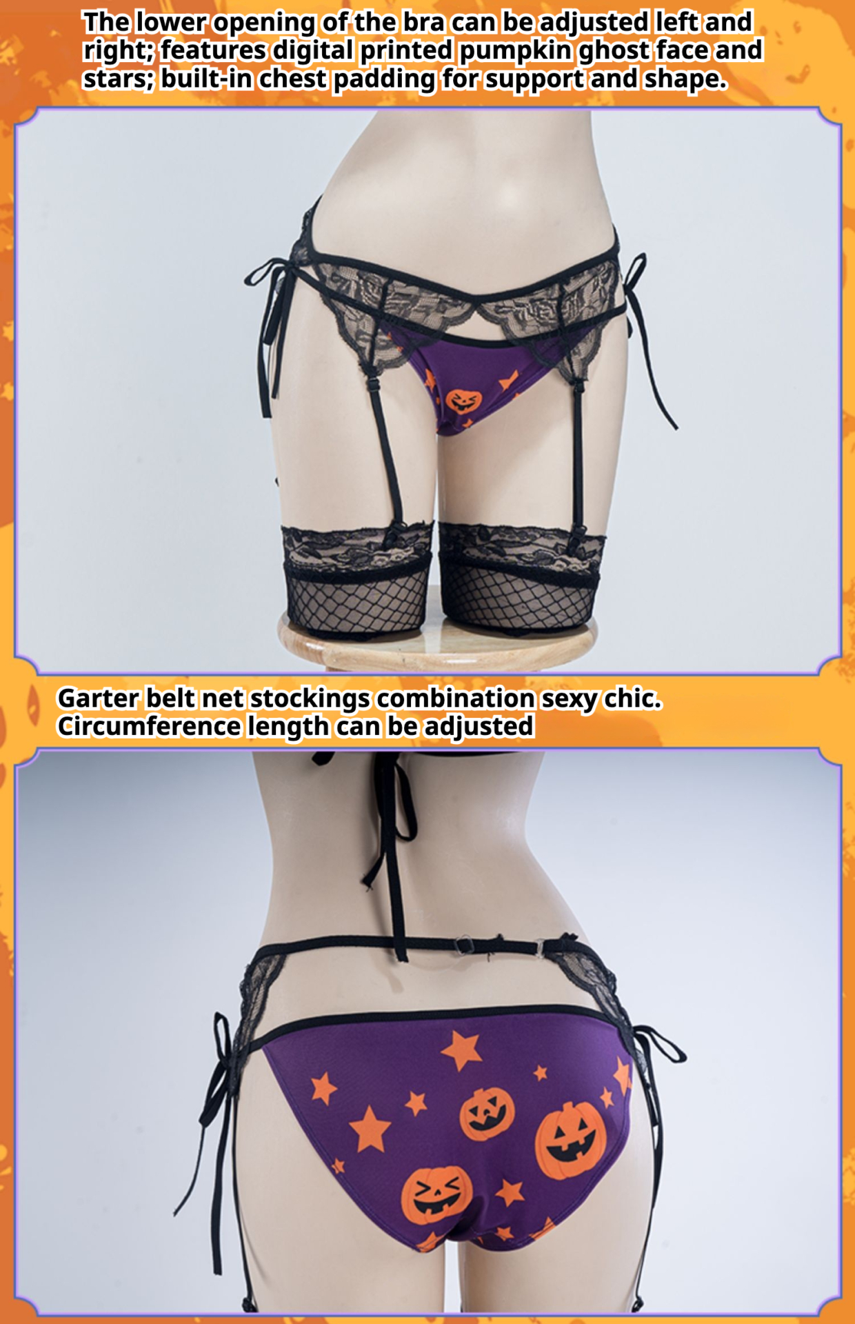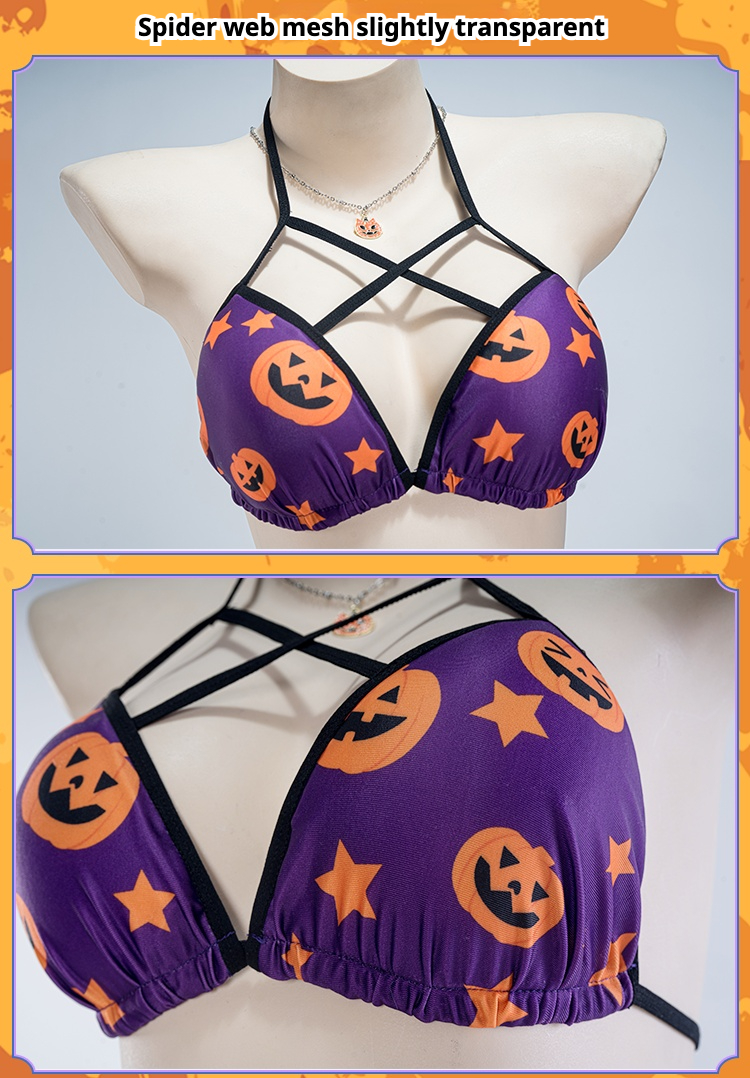 The lower opening of the bra can be adjusted left and right; features digital printed pumpkin ghost face and stars; built-in chest padding for support and shape.