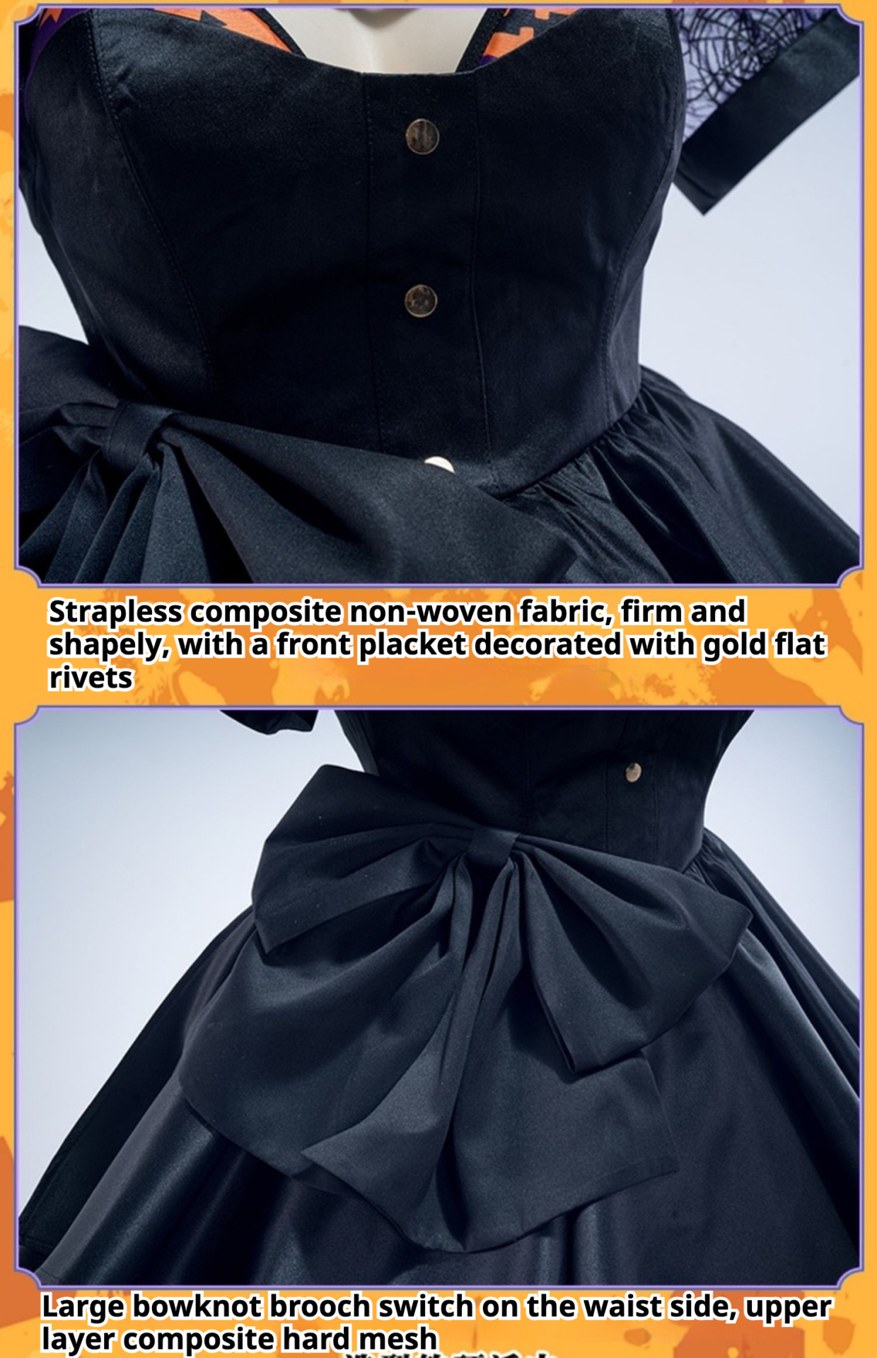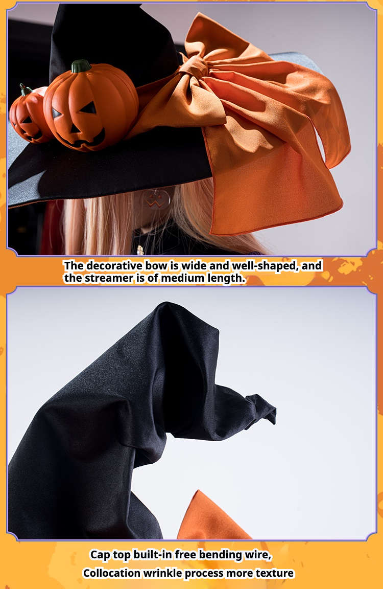 Witch hat, fish mouth clips *2, pumpkin ear clips *2, large fairy ears *2 (gift), pumpkin head necklace, dress, swimsuit top, swimsuit bottom, black gloves *2, side waist bow, garter belt, high-transparency knee-high socks *2, Fishing net over-the-knee socks*2, stacked socks*2, one A4 tattoo sticker (free).